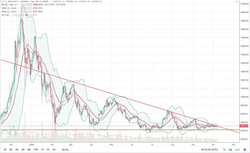Глядя на сегодняшний график цены биткона, мы видим, что он продолжает двигаться в нисходящем треугольнике и начинает достигать дна, где колебания цены менее значительны. В результате, биткоин укрепляется в диапазоне $6100-$6500. Кроме того, существует значительное затягивание полос Боллинджера, чего не наблюдалось в течение очень долгого времени.