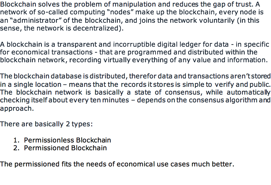 A blockchain is a transparent and incorruptible digital ledger for data - in specific for economical transactions - that are programmed and distributed within the blockchain network, recording virtually everything of any value and information.