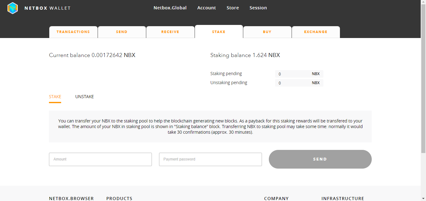 Ses derniers temps, son cours a diminué. Il faut donc en profiter pour gagner le plus de Netbox possible. Pour en gagner, il faut juste naviguer sur Internet, écouter se la musique ou aller sur Youtube. Bien évidemment, plus vous utilisez le navigateur et plus vous gagner de crypto. Vous avez également la possibilité de gagner des intérêts en stockant vos cryptos. Ci-dessous l'onglet pour bloquer ses fonds.
