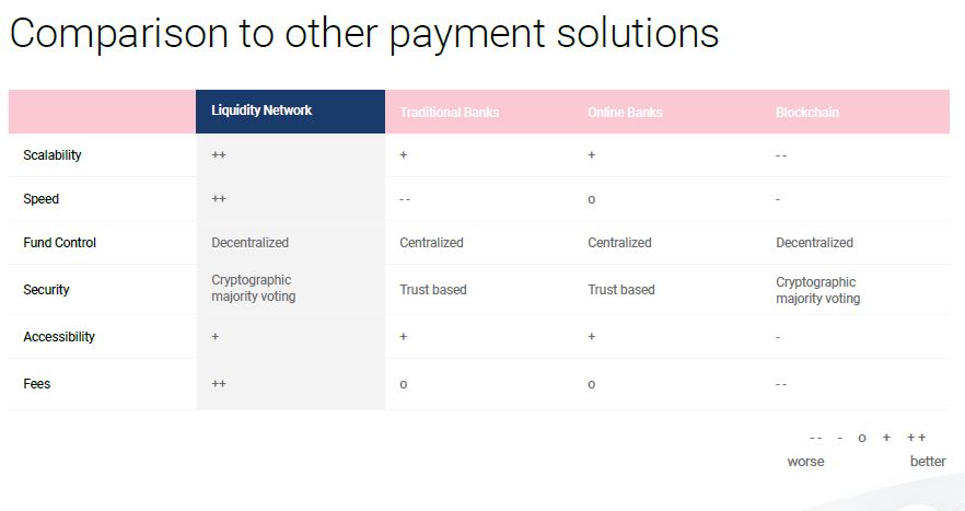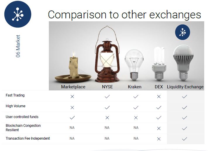 The following images give a graphic illustration of how Liquidity Network compares with other networks, and how Liquidity exchange compares with other exchanges.