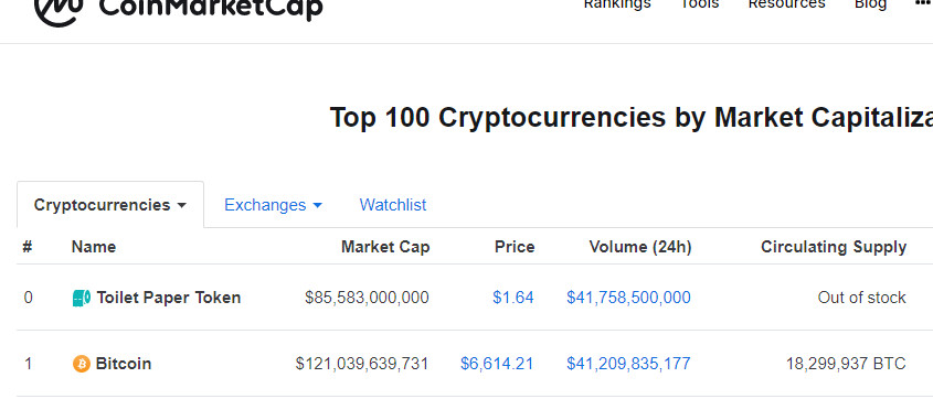 Toilet paper token is a true shit coinmadalchemist (52)in #crypto • 6 years ago Coinmarketcap is pretty funny #covid19 #virus #cryptocurrency