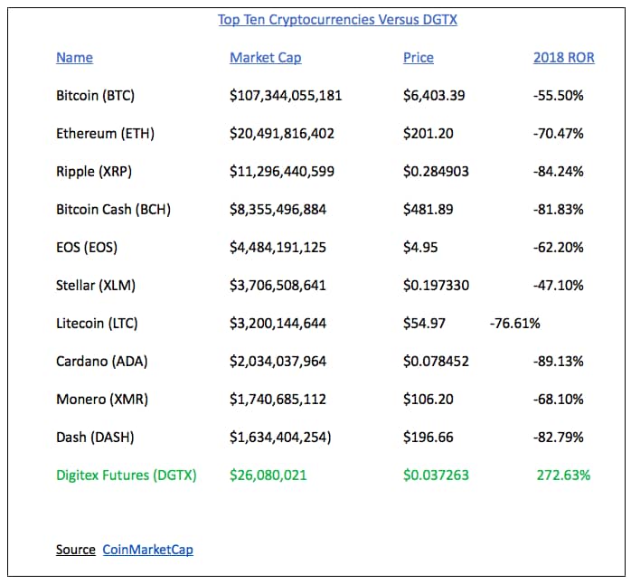 • DGTX has dramatically outperformed the top ten cryptocurrencies by 2018.