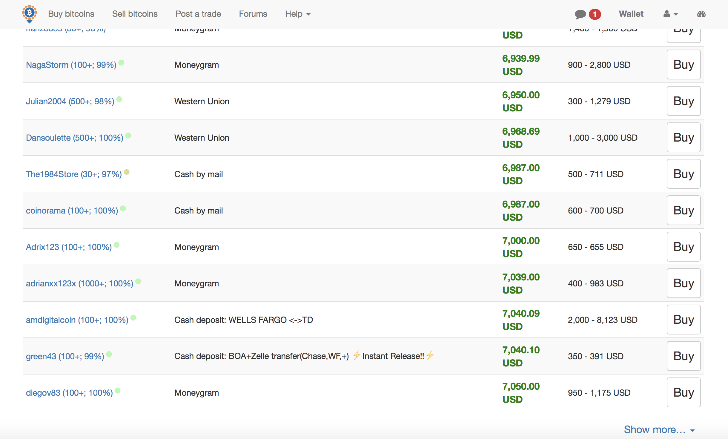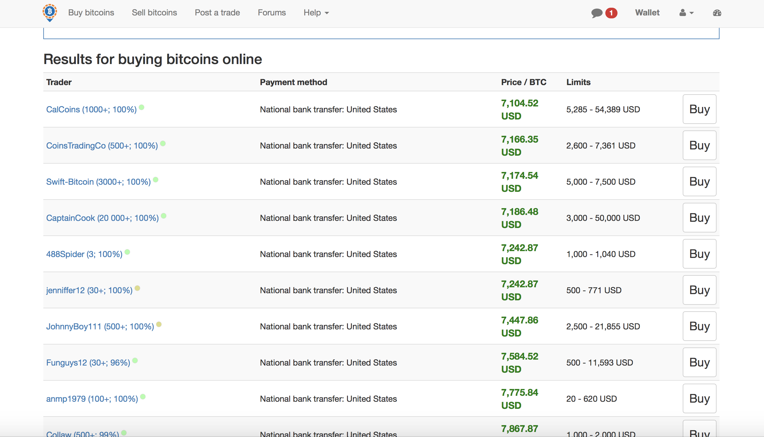 In this photo right on the top I see that cal coins sells cheaper than everybody at 7104 but he has limits of minimum 5000 usd so thats not for the most people so I keep searching for one that has normal limits now I see amp limit from 20 bucks to 600 thats good now I see that he is selling for 7775.