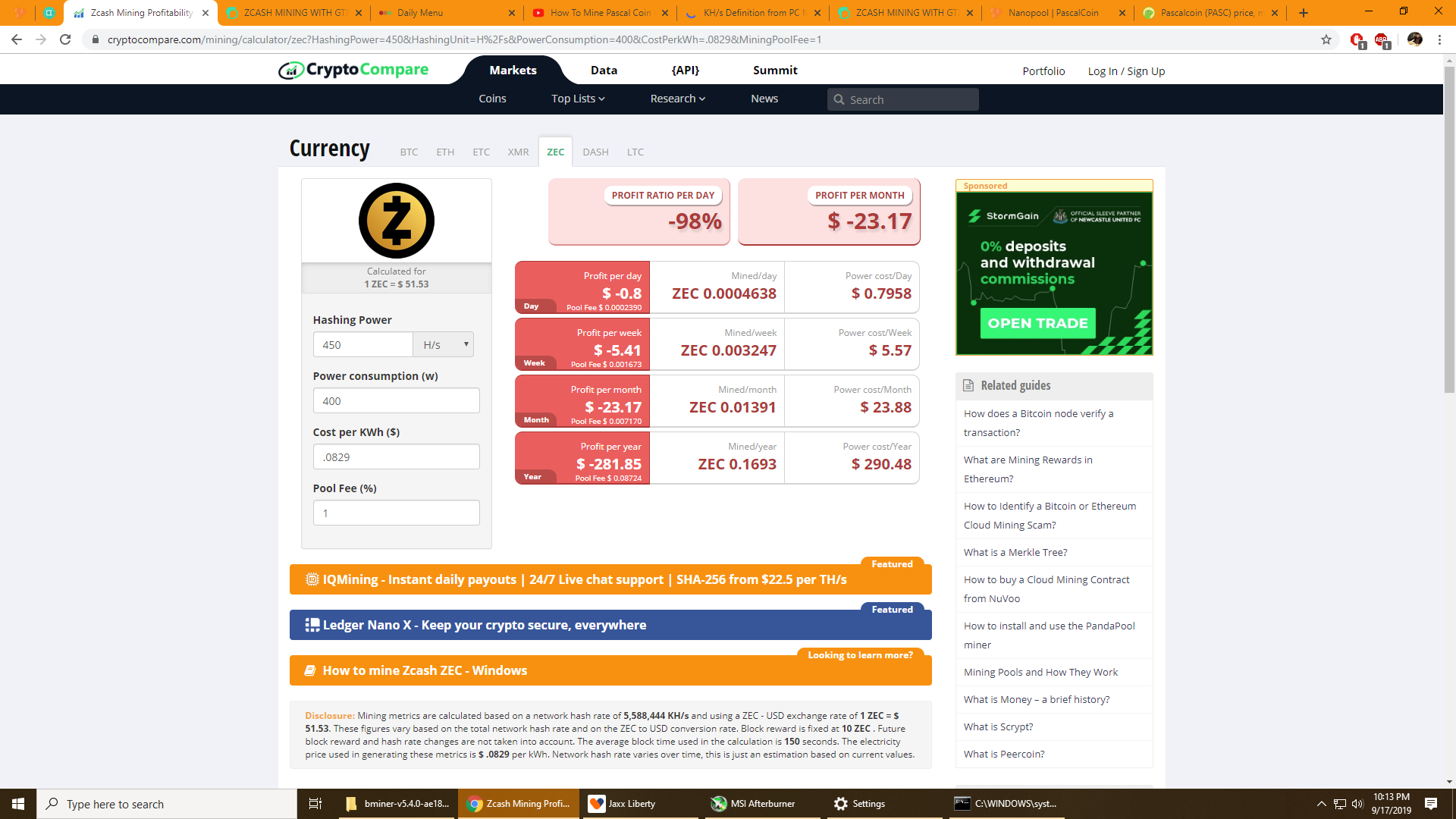 at the current rate of 450 SOL/S Equivalent of 450 H/S and the current price of Zcash at 51$usd mining this coin would cost on average .80c a day a net loss of 23$ per month or 280$ per year not very good at all!