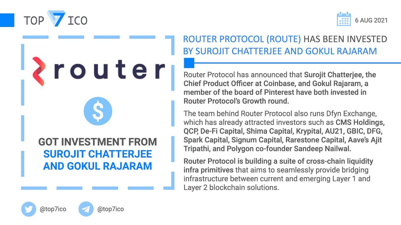 Router protocolmodibbo (34)in #crypto • 5 years ago 🚀routerprotocol $ROUTE has been invested by Surojit Chatterjee and Gokul Rajaram Router has announced that surojit Chatterjee, the CPO at coinbase, and gokulr Rajaram, a member of the board of Pinterest have invested in Router’s Growth round.