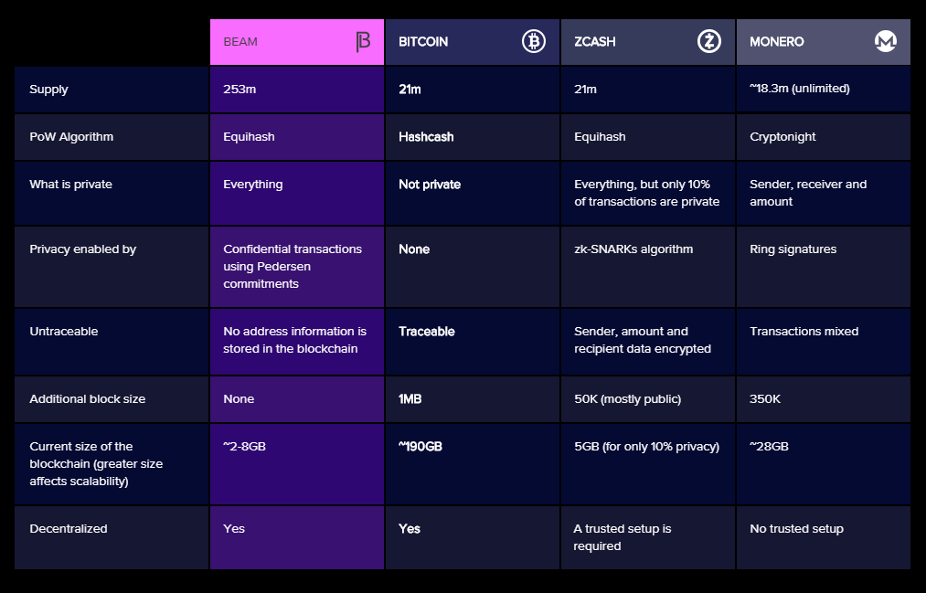 We have seen the features of the MimbleWimble protocol, which ensures privacy at a high level. BEAM is a project based on the MimbleWimble protocol, and thus, BEAM uses the properties of the MimbleWimble protocol to ensure the privacy of users when funds are sent and received. Infact, check the image below that shows the comparison of BEAM with other blockchains.