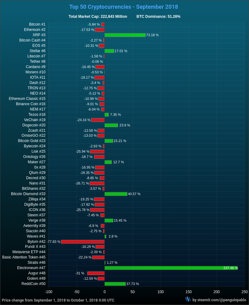 The third quarter of 2018 is over and September was another month of losses for most cryptocurrencies. Only HODLers of XRP (Ripple) have a reason to celebrate. There's a battle going on between Ethereum and XRP for the second position on the list of all coins ranked by market capitalization. This flippening happened twice last month, but for the time being Ethereum still has the second place.