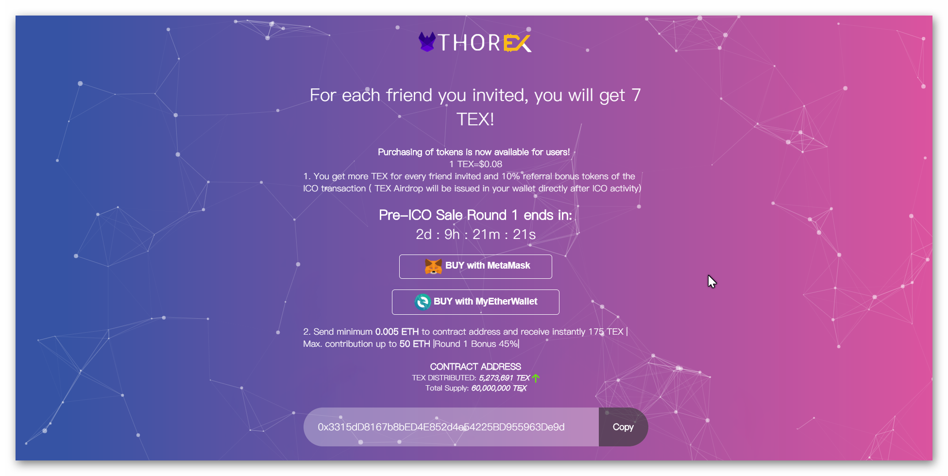 2d : 9h : 27m : 22s - Send minimum 0.005 ETH to contract address and receive instantly 175 TEX | Max. contribution up to 50 ETH |Round 1 Bonus 45%|