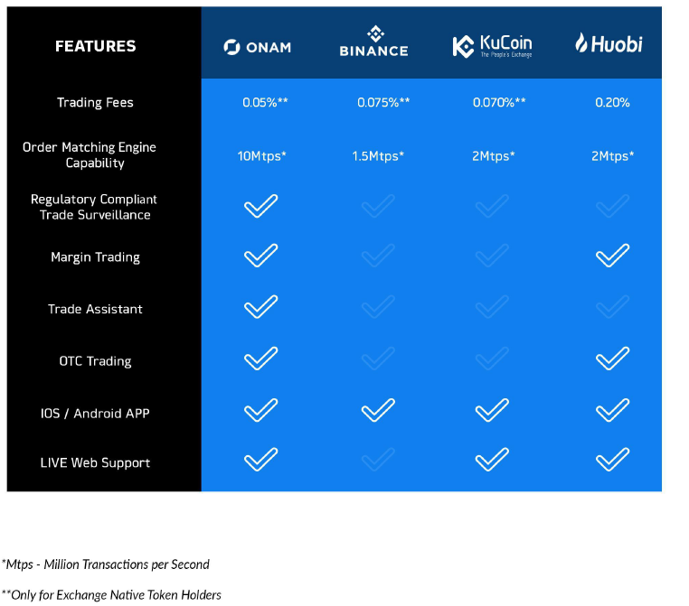ONAM is a robust cryptocurrency exchange, which far surpasses its competitors. ONAM offers its users all commercial markets in one place, margin trading, over-the-counter trade, margin loans, paper trading, compound funds. In addition to offering a set of tools to optimize cryptocurrency trading. ONAM takes security into account, so it goes beyond standard DDoS mitigation, anti-phishing, 2FA solutions and encrypted databases. ONAM has developed its own intrusion detection and trade surveillance system. In addition, to store 99% of the funds in Class III bank-class vaults. ONAM establishes a communication system with its users, 24/7/365 in several languages, providing accompaniment and direct support in case of any eventuality. ONAM is a comprehensive and very advantaged cryptocurrency exchange, which offers its users security, accompaniment and even education regarding the world of trading, as strategies (with the use of simulators) and legal and technical aspects that are of a important and mandatory compliance.