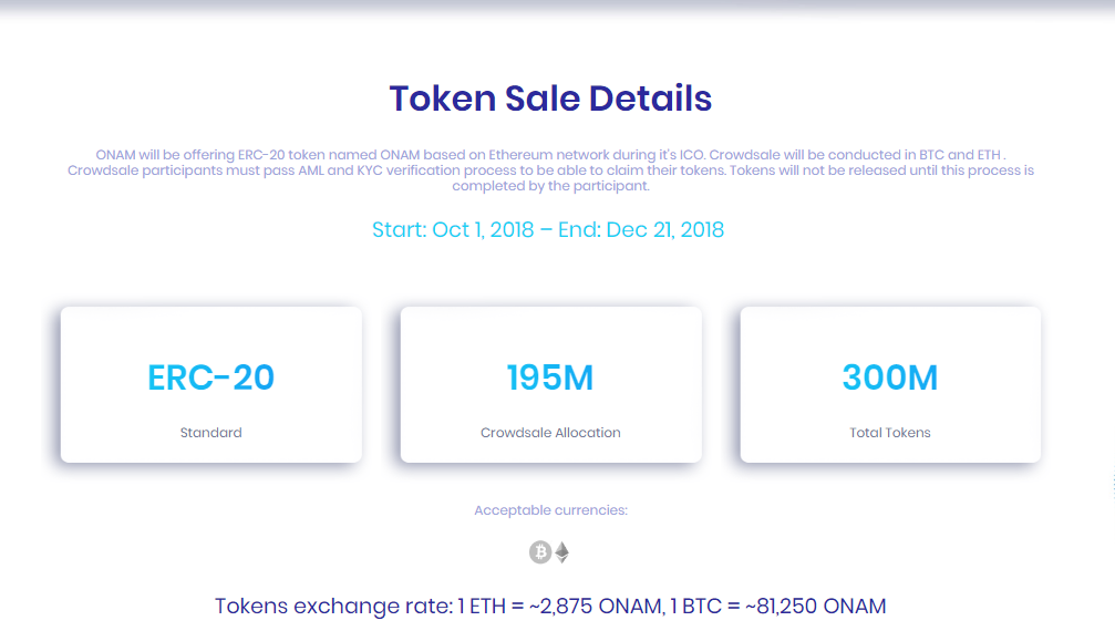 This token is called ONAM is based on Ethereum and is important for its capabilities within the platform, with its acquisition you will get discounts, everyone must pass the process of verification of AML and KYC to be able to claim their tokens.
