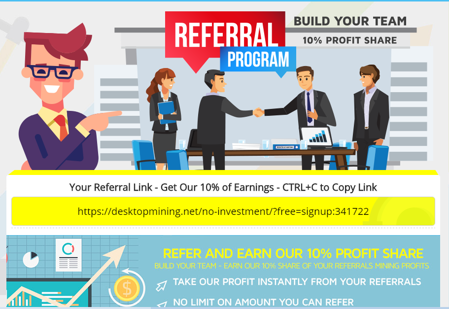 You can refer people to Desktop Mining and earn our 10% profit share, that means that you can earn 10% from everyone you refer. We update your teams earnings every 60 to 90 minutes directly to your account, meaning you get paid for life based on what your referrals earn.