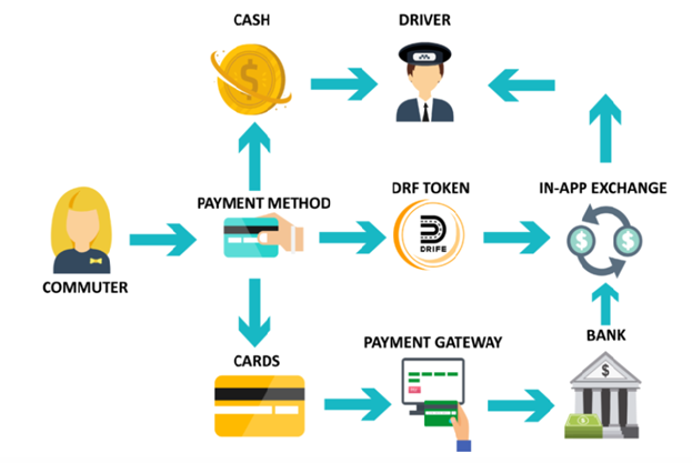 Да потому,ичто вы получаете возможность оплатить совершённую поездку не только наличными или картой, но еще и токенами DRF. Не плохо, правда? Это позволит вам воспользоваться предоставленным выбором оплаты, а, главное, - вы оплачиваете полностью всю поездку водителю. Таким образом, получается прозрачная система, благодаря которой нет никаких тайных и скрытных отчислений и все полученные средства остаются в данной конторе. Вот наглядная картинка: