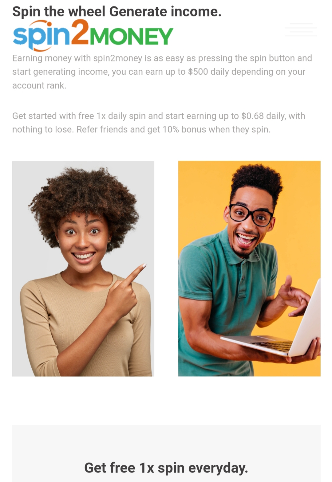 A very good site to make income online. No need to invest, you can earn 0.20-0.68 per day with a free account. Withdrawal can be done in different ways including Bitcoin, bKash for only 5 dollars. You have to spin once in 24 hours on a free account, that's the job. If you want to upgrade the account, you can upgrade with income money. Click on the link below to create an account -