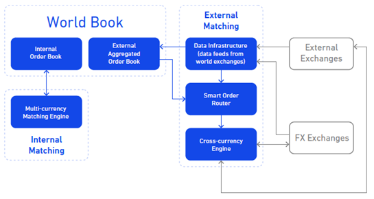 World Book consists of the internal order book and external aggregated order book, using FX market for creating fiat-crypto pairs never existed before.