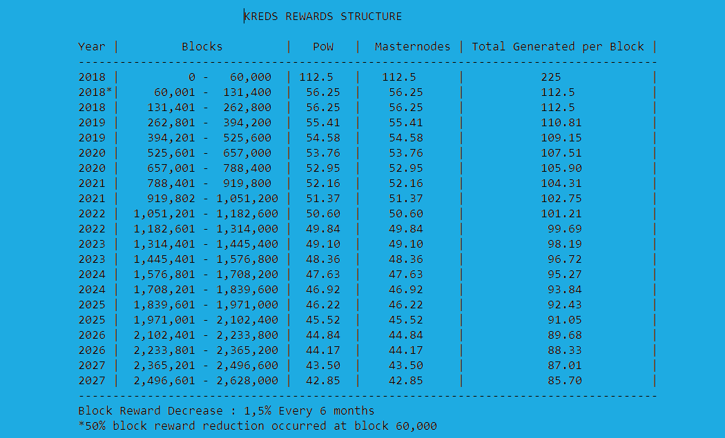 Masternode coll. is 100,000 KREDS, and the MN's is rewarded 50% of block rewards.