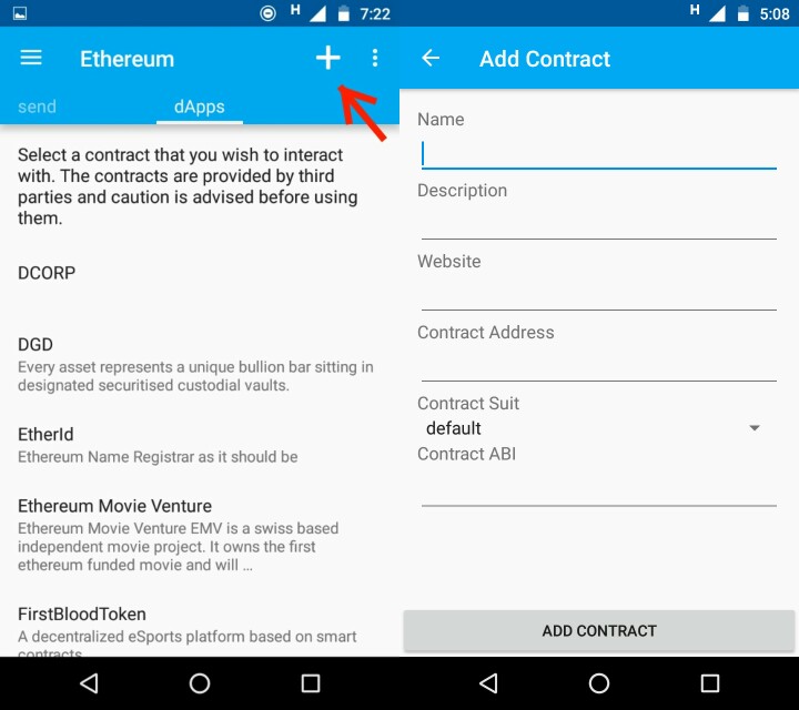2. Теперь выбираем кошелёк Ethereum с обзорной страницы. Дважды проведите пальцем по экрану, попадаем на страницу dapps. Там уже есть некоторое количество токенов доступных к использованию, но в этом посте я покажу вам как добавить токены которых в списке нету. Нажмите "+" в правом верхнем углу.