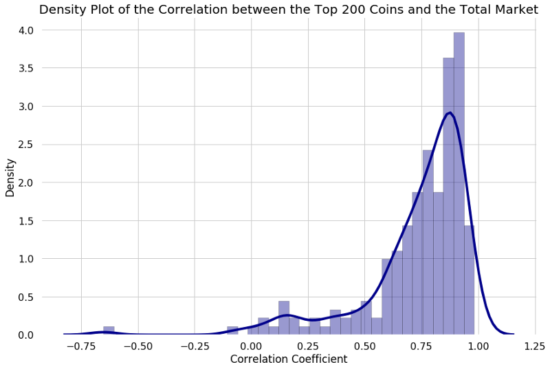 From a glance, our density plot indicates that most coins in the top 200 are highly correlated with the market.