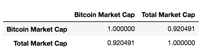 Once we have data for BTC’s market cap and the overall market, we can calculate the Pearson correlation coefficient between the two over the entire time period.