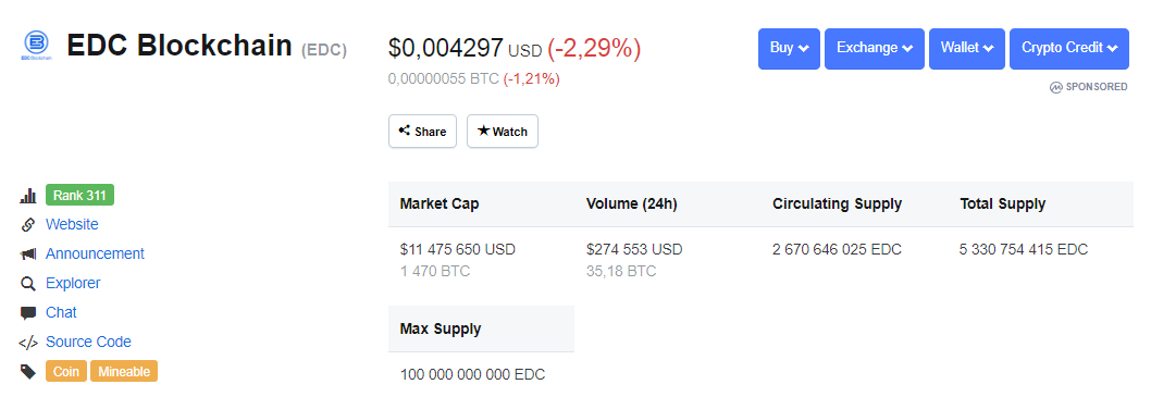 - Монета EDC торгуется на более чем 5 популярных криптовалютных биржах.