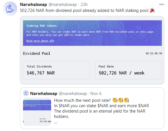 - Allocated for Narwhalswap Liquidity : 1,102,500 NAR 5.25%