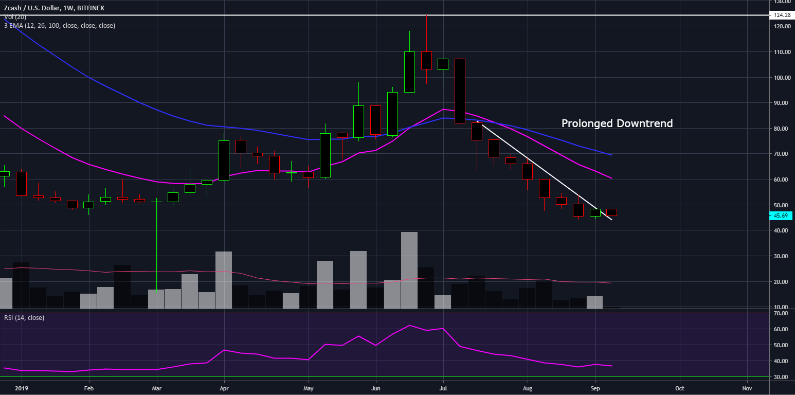 ZEC, like many other cryptocurrencies, has experienced a prolonged downtrend after the first half of 2019.