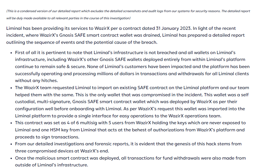 WazirX’s Claim: WazirX blames Liminal, suggesting discrepancies between the transaction data received by Liminal and the actual transaction details led to the hack.