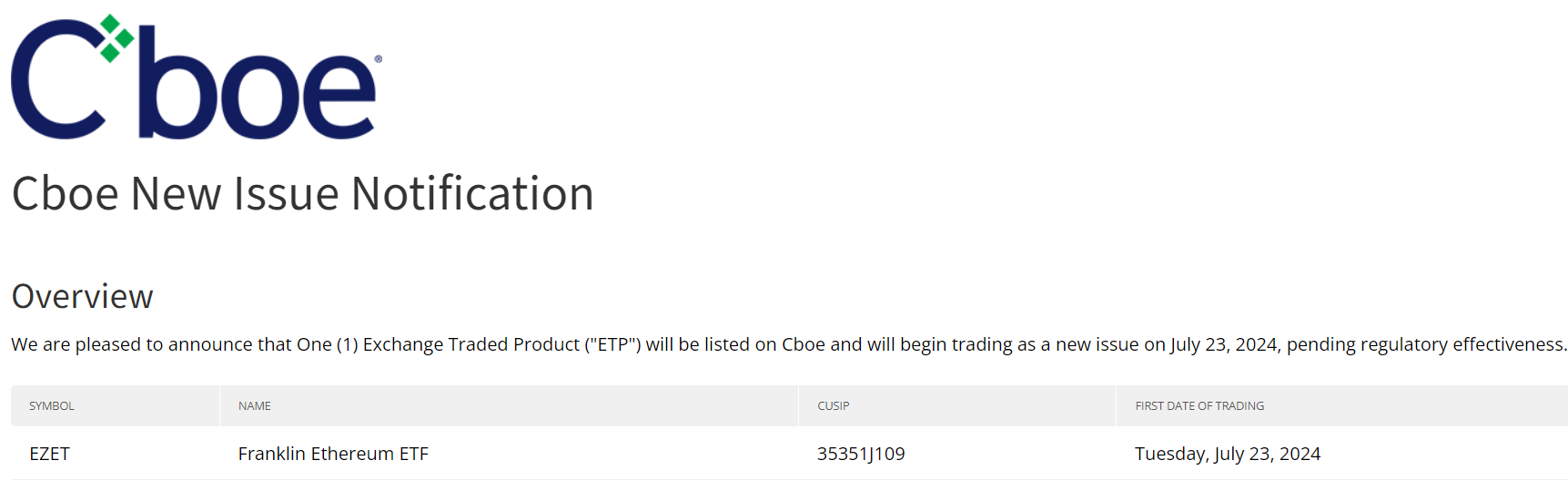 On July 23, five spot Ethereum ETFs might be approved by the CBOE Exchange. These involve institutions like Invesco, Fidelity, 21Shares, and Franklin.