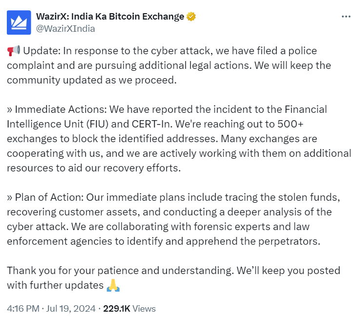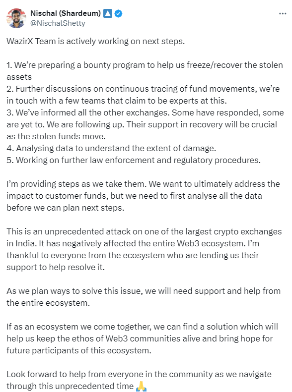 According to Shetty from WazirX, the team is preparing a bounty program to incentivize individuals and entities to help freeze or recover the stolen assets. This program is part of their strategy to enhance efforts in tracing the stolen funds.