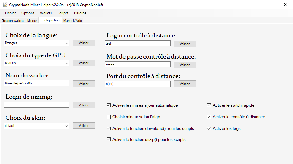L'onglet de configuration vous permettant de modifier toutes les options de MinerHelper: