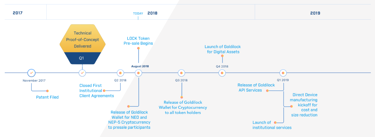 Goldilock will have its own token, which is the LOCK token which is a NEP-5 asset within the NEO blockchain, users will be able to obtain the token lock and combine it with Goldilock's patented intelligent contract logic, making the storage and backup of their private keys, provide a special mechanism of immutable audit for each individual node using by default the Byzantine fault tolerance.