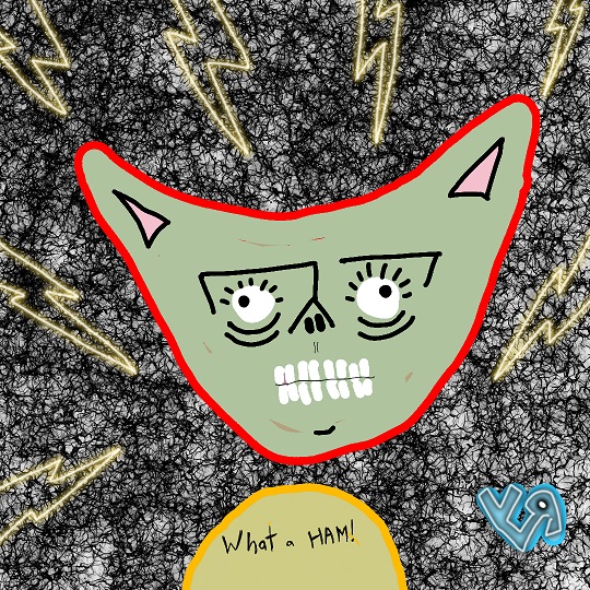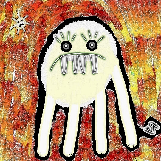 Again, all digital. This one flips the parameters from the previous one. I really like the background here, with the webby bits and the neon lightning bolts---but that FACE on the monster is just gross. It’s so ugly it’s almost not funny at all… (I’m not very comfortable with the darkness evident in some of my artwork, and this sucker is just yucky…)