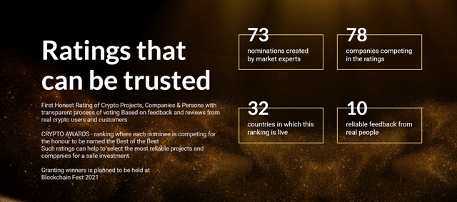 Crypto Awards is first honest rating of crypto projects, companies and persons with transparent process of voting Based on feedback and reviews from real crypto users and customers.