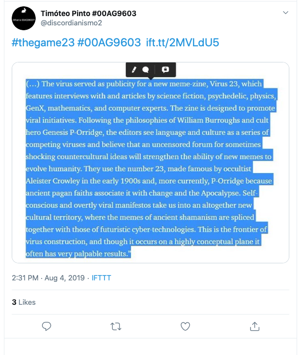 The whole 23 thing is from the Discordians, which we covered in mind-blowing depth in my interview with David Livingstone: