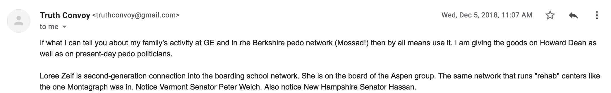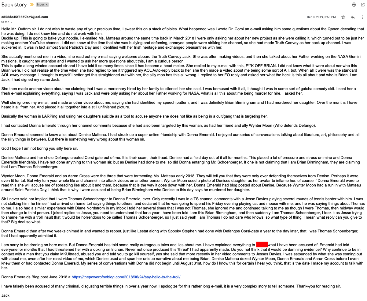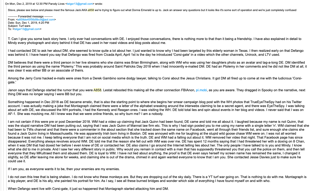 The A858 account became part of "CorsiGate", where emails between Jerome Corsi and who he thought was "Q" were revealed. The email headers appears to indicate that for some reason Denise Matteau was copied on some of these emails.