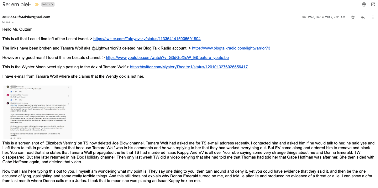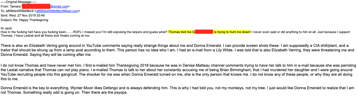 In this post are a selection of emails I received from this account. I'm not posting everything, but this is most of it. Why do people send me this stuff? Maybe because they trust that I'm an evidence-based researcher and therefore my audience is interested in seeing primary source evidence. Maybe because I seem to be one of the few people on the entire Web to be writing about these LARPs (see also Tracking the Leopard Meroz and Lenox7.com). Or perhaps I've been tagged in some sort of ARG. Donna Emerald is a promoter of #TheGame23, which i mentioned in Silicon Valley's Secret Weapon Part 7 - Social Engineering on the Electronic Frontier.