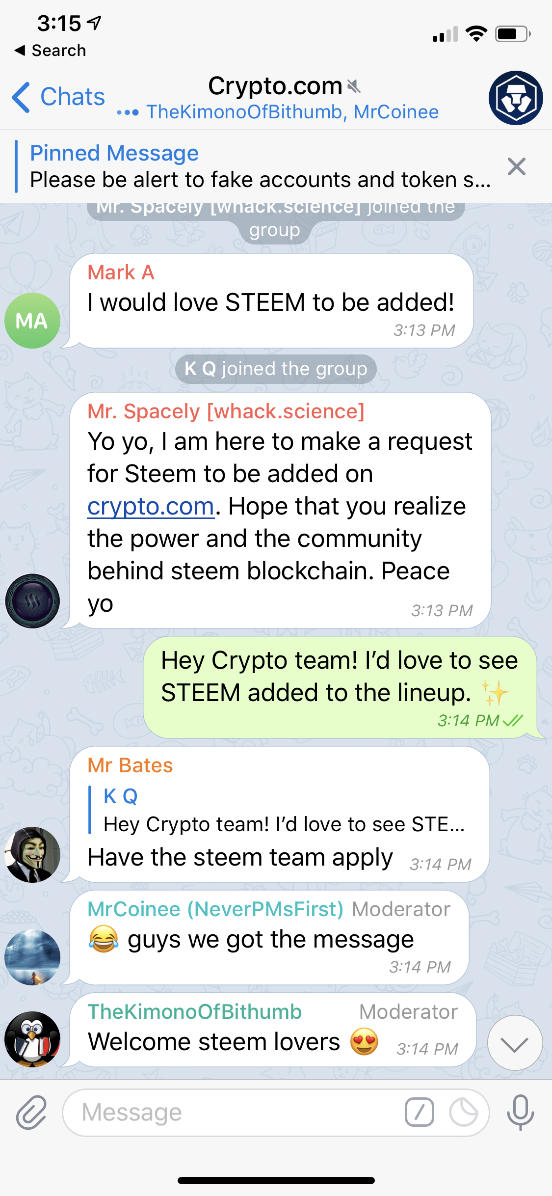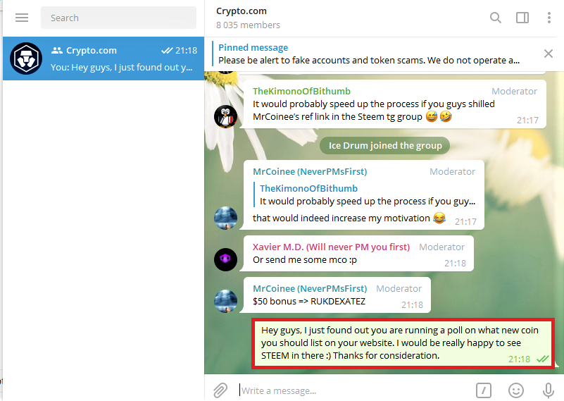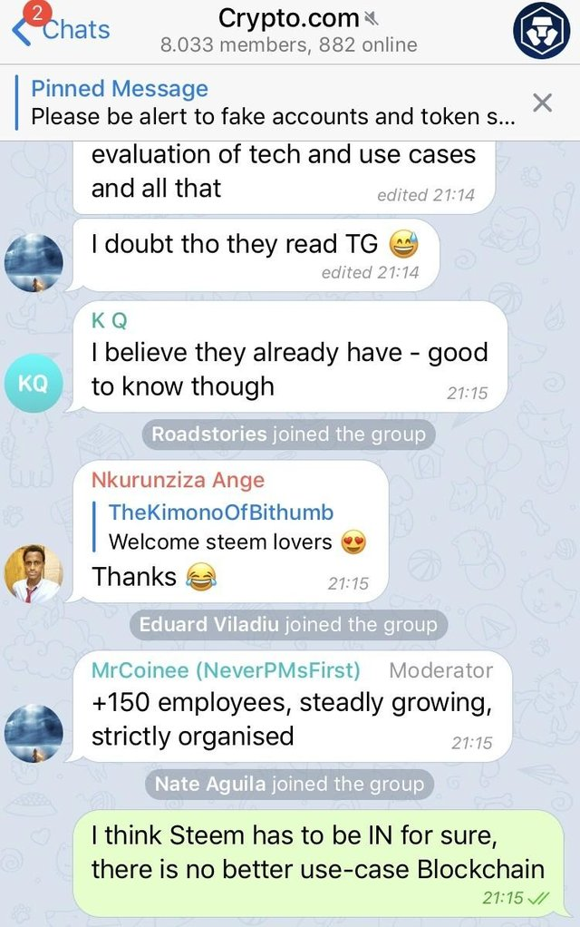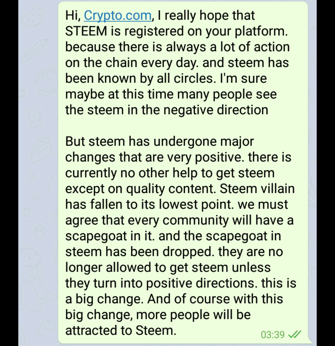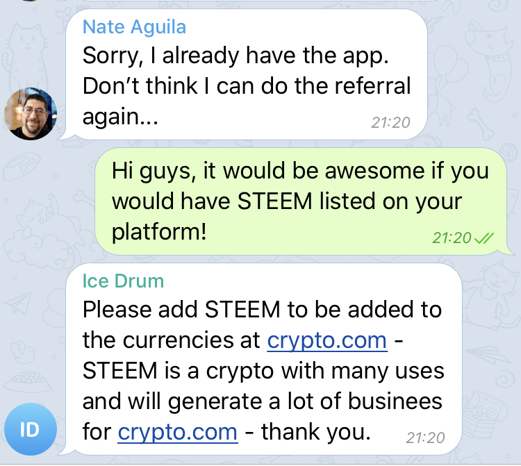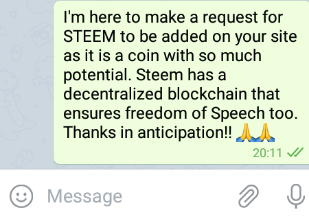 I have just gotten word that our efforts were successful and they are having internal discussions to add Steem now! They simply wanted to see if there was a demand for Steem from their telegram users.