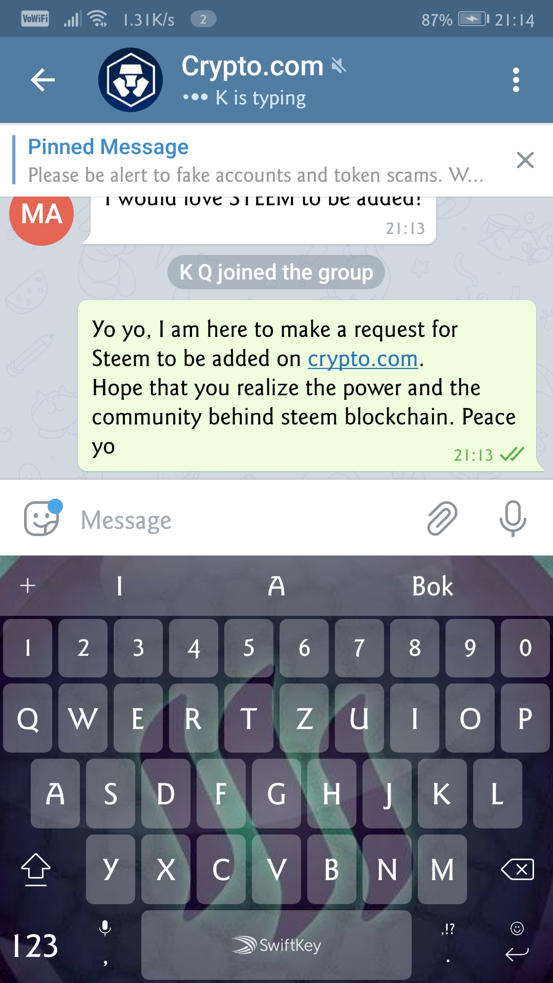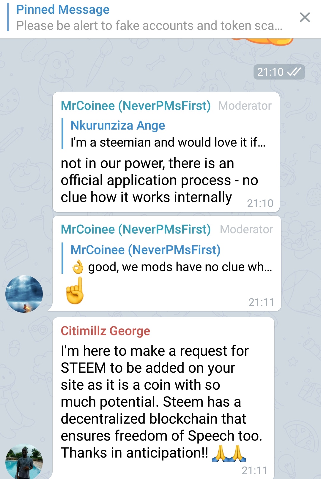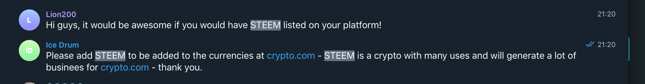 I have just gotten word that our efforts were successful and they are having internal discussions to add Steem now! They simply wanted to see if there was a demand for Steem from their telegram users.