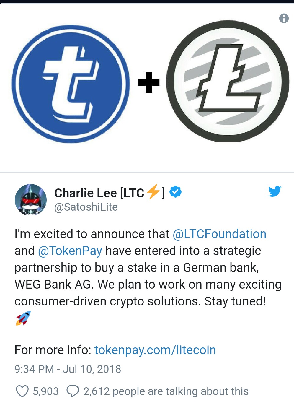 But well ,charlie lee, founding father of litecoin is thinking just that. not just wondering. mr. lee used his twitter account simply a couple of days ago to announce that he's teaming up with tokenpay to buy a widespread stake in germany’s weg bank. the idea behind this flow is for litecoin to get toward terminal users, clients, and give them an smooth-to-use, and cheap way to get concerned in litecoins in real-life.