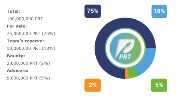Date: August 22 - October 22 Token name: PRT Blockchain: Ethereum Standart: ERC20 Minimum amount: 100 PRT Soft Cap: no Hard Cap: 13,500 ETH Accepted: ETH Total tokens: 100,000,000 Available for sale: 75% Price of the token: 1 ETH= 3,500 PRT.