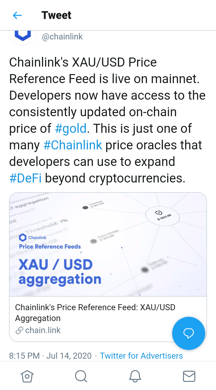 As this brings on the chainlink mainnet with update and up to time gold prices, still on the chainlink oracles