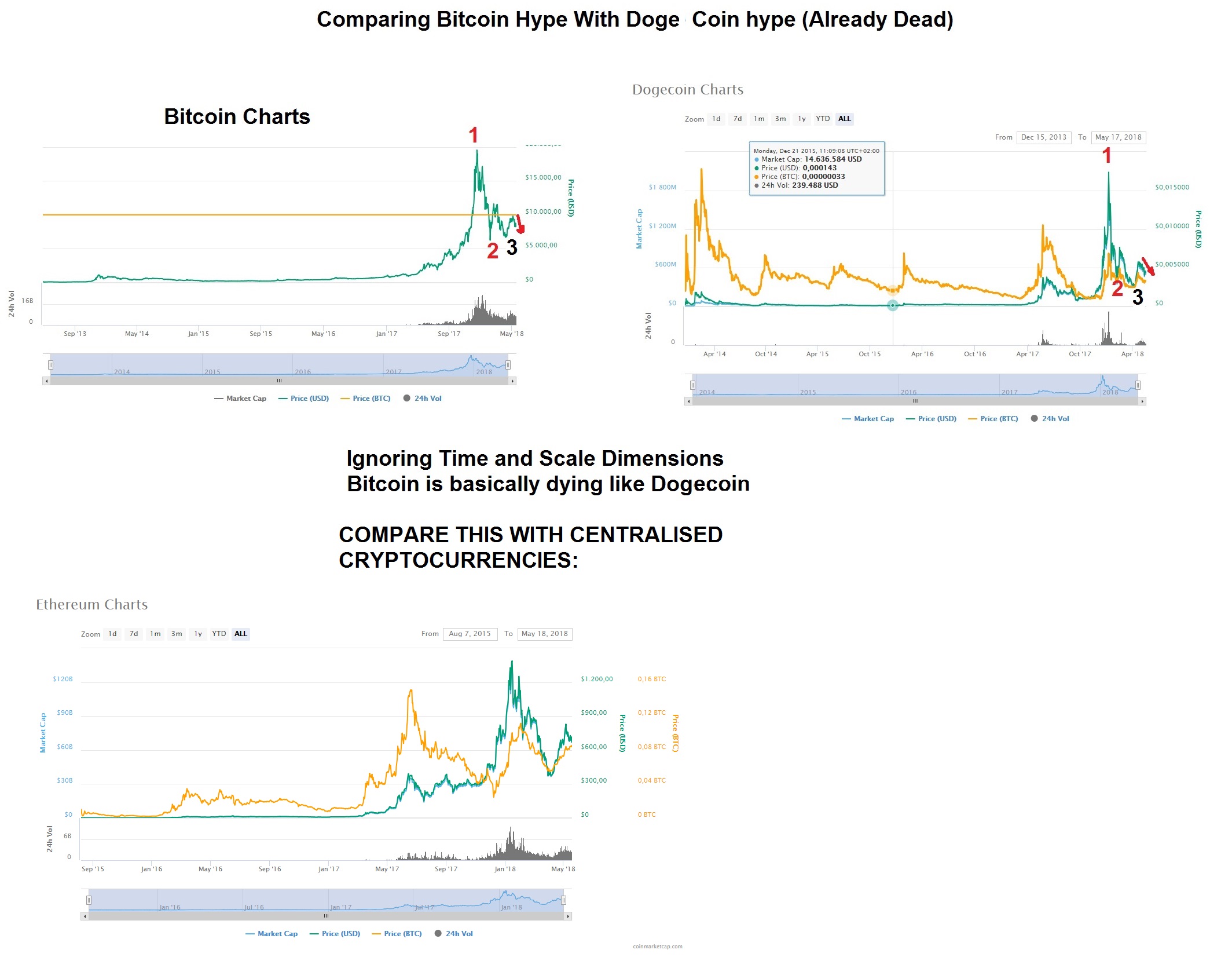 Is Bitcoin's value diminishing due to same marketforces as other hype coins, with similar shape but other scale?