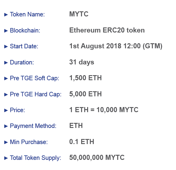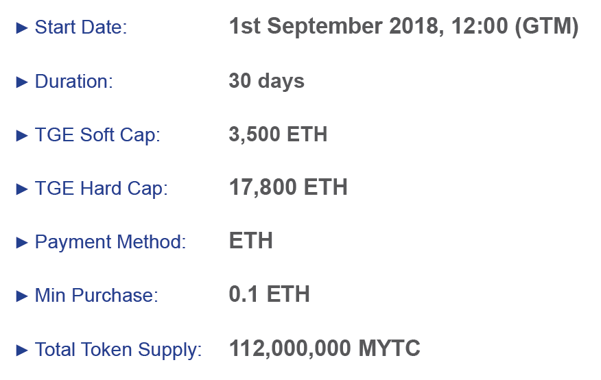 TGE will begin on September 1st and will end 30 days or whenever hardcap 17,800 ЕТH or equivalent to 112,000,000 MYTC with minimum purchase of 0.1 ETH.