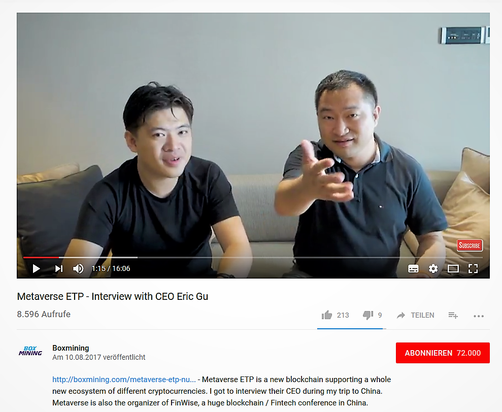 Eric Gu is an experienced IT developer and founder of ViewFin (the developing company of Metaverse). He lists 12 years of working experience in the US and Canada as well as 4 years in China and is one of the Co-Founders of Antshares (today called “NEO” and the Chinese blockchain project with the biggest market capitalization of all Chinese projects). 3 Eric Gu is also the one who came up with “Antshares” as the name for the project.5 Basically this means that he seems to know his stuff, when it comes to crypto currencies – he in fact claims be interested in this industry since 2014.