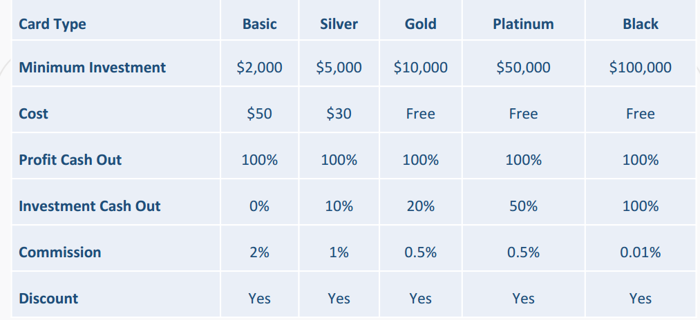 Decoin provides 5 different credit cards with different benefits as shown below: