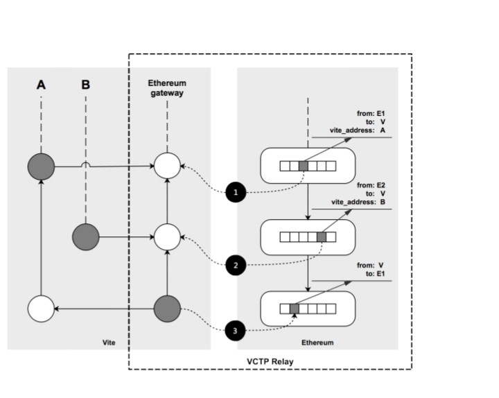 package a transaction of the Ethereum to the Vite gateway contract on the Ethereum. In the Ethereum , the Vite gateway contract will verify whether this transaction is initiated by a trusted VCTP relay, and then the same amount of ether