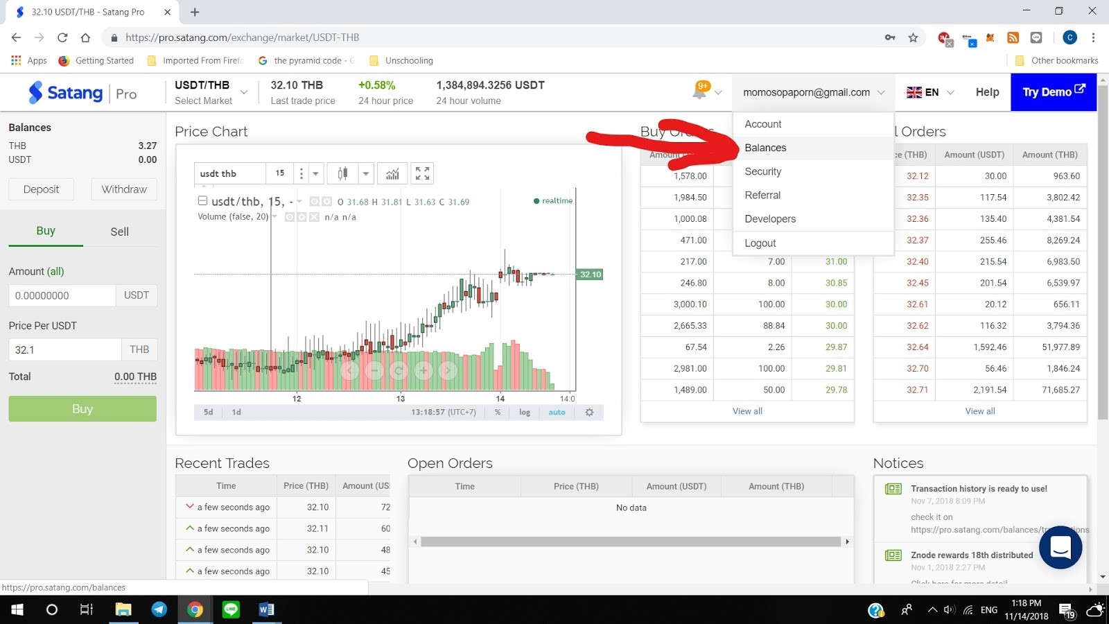หลังจากที่เราได้ Usdt กันมาแล้ว. ก็ไปกดตรง Balane. เพื่อเตรียมจะโอนหรือ withdrew กันได้เลย. (After purchase, proceed to the “Balances” page)