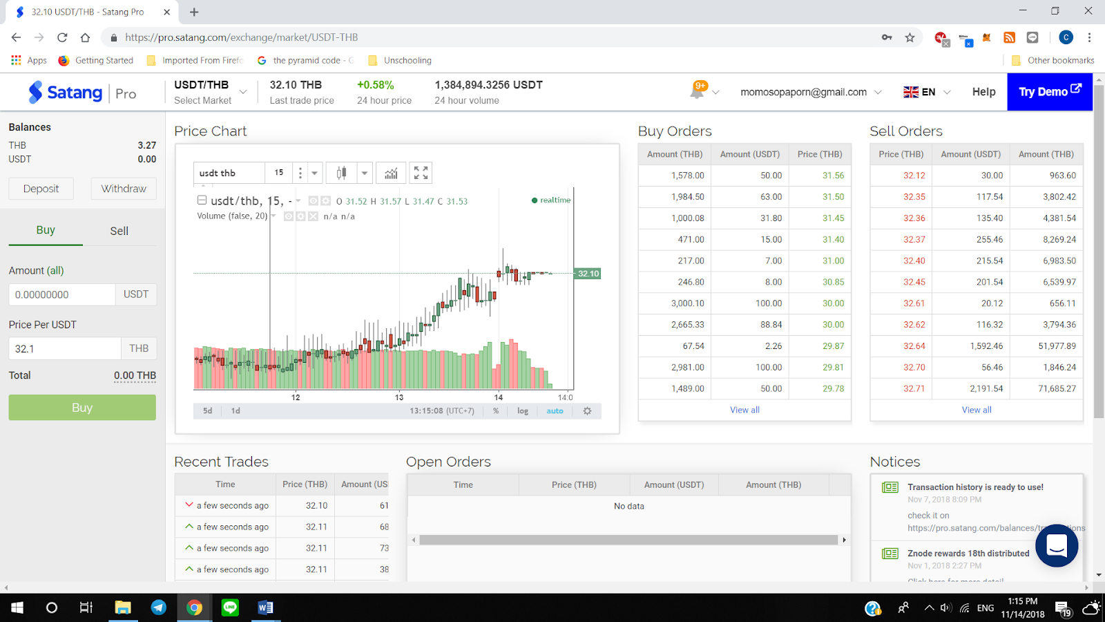 หลังจากที่โอนเงินเข้ามาแล้ว. ก็เปลี่ยนเงินไทยเป็น Usdt. โดยการเทรดคู่แพ. Usdt /THB. (After the deposit is complete, go to the USDT/THB pairing on the Satang Pro Exchange)