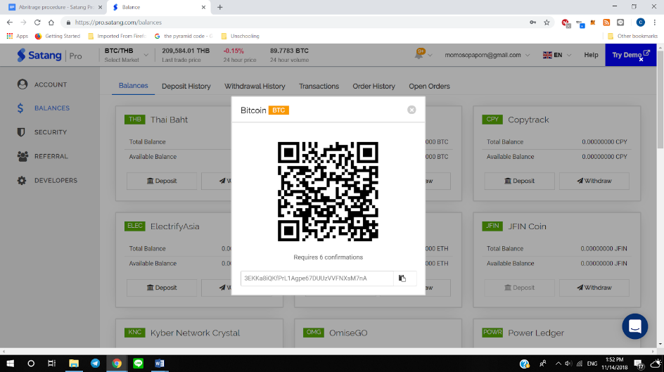 กลับไปยังหน้า Satang Pro. และไปที่หน้า Balance จากนั้น เลื่อนลงหา Bitcoin และกด deposit. (Back at SatangPro, on the “Balances” page, scroll to bitcoin and click “deposit”)