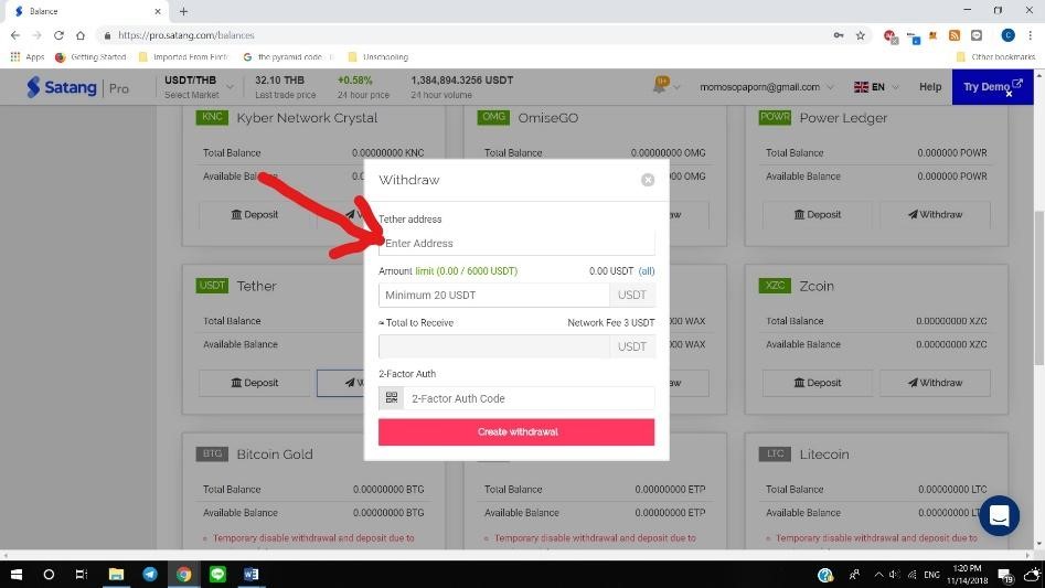 Copy รหัส Address ตรง Usdt deposit ( Copy the USDT deposit address and go back to SatangPro withdraw form)