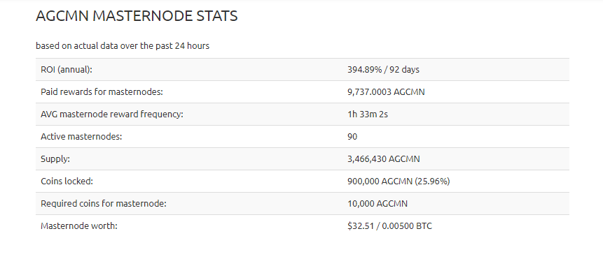 You can see detail on Masternode online here: https://masternodes.online/currencies/AGCMN/